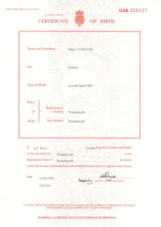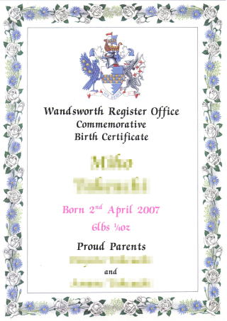 birth certificate(記念用出生証明書)」というのもあって、あまり申し込んでいる人は多くないようだが、日本にはそんな物は絶対にないので、話のネタに申し込む。一枚5ポンドだが、同じ物を2枚買えばもう一枚ついてくる(要するに10ポンドで3枚、ということ)ので、10ポンド払って3枚を申し込んだ。