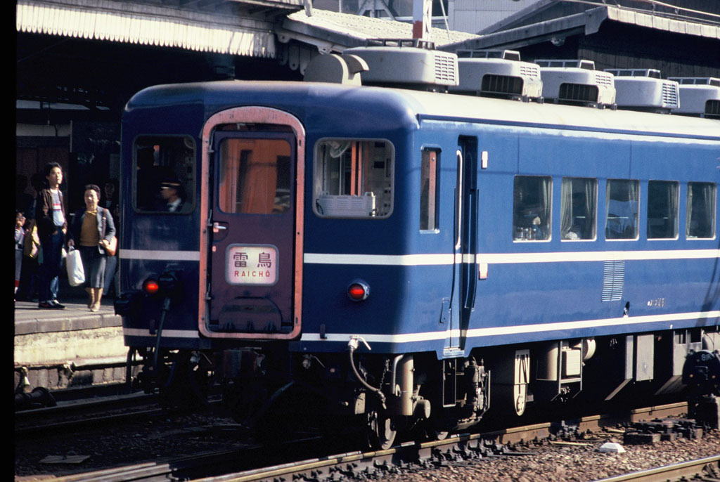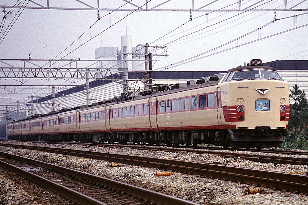 北海道初の電車特急「いしかり」用に製造された485系1500番台は、その役割を終えて本州内特急に転用され、「雷鳥」にも使用されていた。JR発足直後、JNRマークとJRマークの両方が見える。