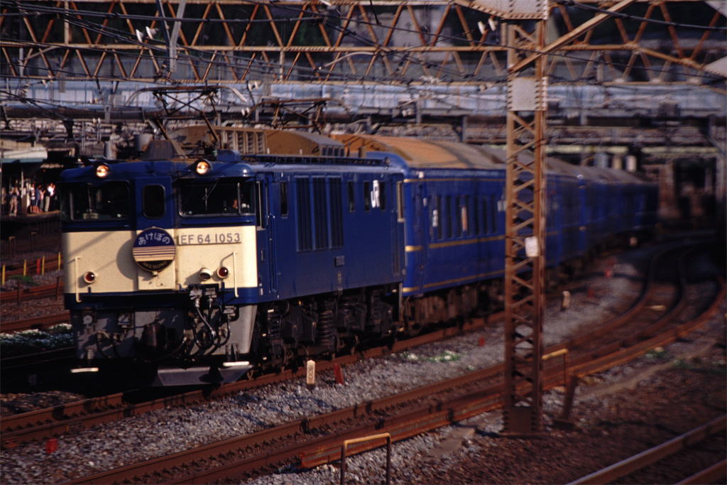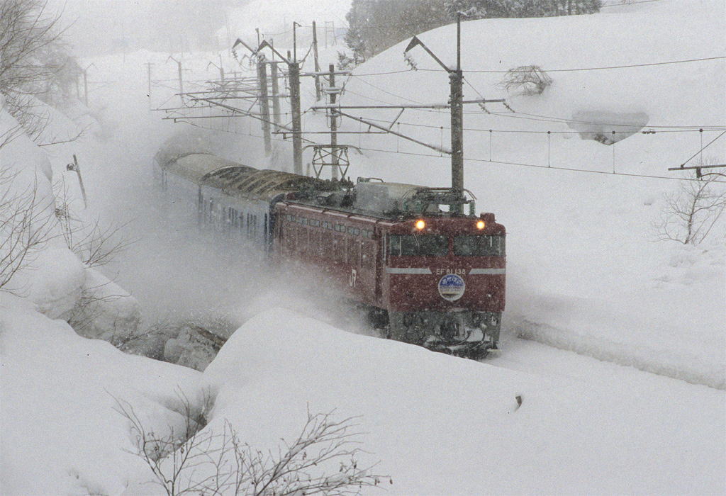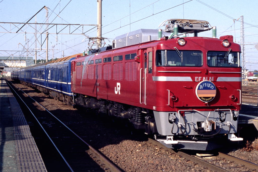 上野−青森間を奥羽本線経由で結ぶ「あけぼの」。1997年の上越線経由に変更後、上野-青森間をEF81が全区間牽引していたが、上越線内で空転をよく起こし遅延の原因となっている、という理由から2009年以降は長岡-青森間のみに牽引区間が短縮された。写真のEF81