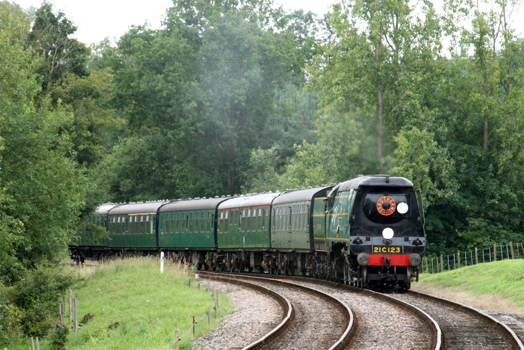 34023号機。国有化以前のSouthern Railway時代の塗色、番号(21C123)に復元されてMidhants Railwayで保存運転されている。なお、本形式は総勢110両のうち60両が国鉄時代にその特徴ある外観が変更されて普通の蒸気機関車然とした姿になっている。