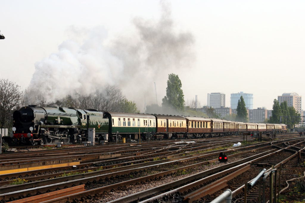 ロンドン発の日帰り観光列車を牽引。客車(プルマン)12両に、後補機が付けられている。Clapham Junctionにて。
