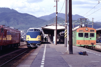 2003年に非電化区間が廃止された可部線の、現在の終着駅である可部駅。旧型国電72系電車の引退直前、1984年の撮影。たまたま検測用気動車キヤ191系が停まっていた。 |