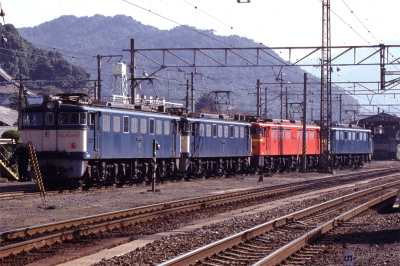 あとおしを終えて瀬野機関区に四重単で引き返してきた補機たち。左からEF61 200番台が2両、そしてEF67、右端もEF61 200番台。 |