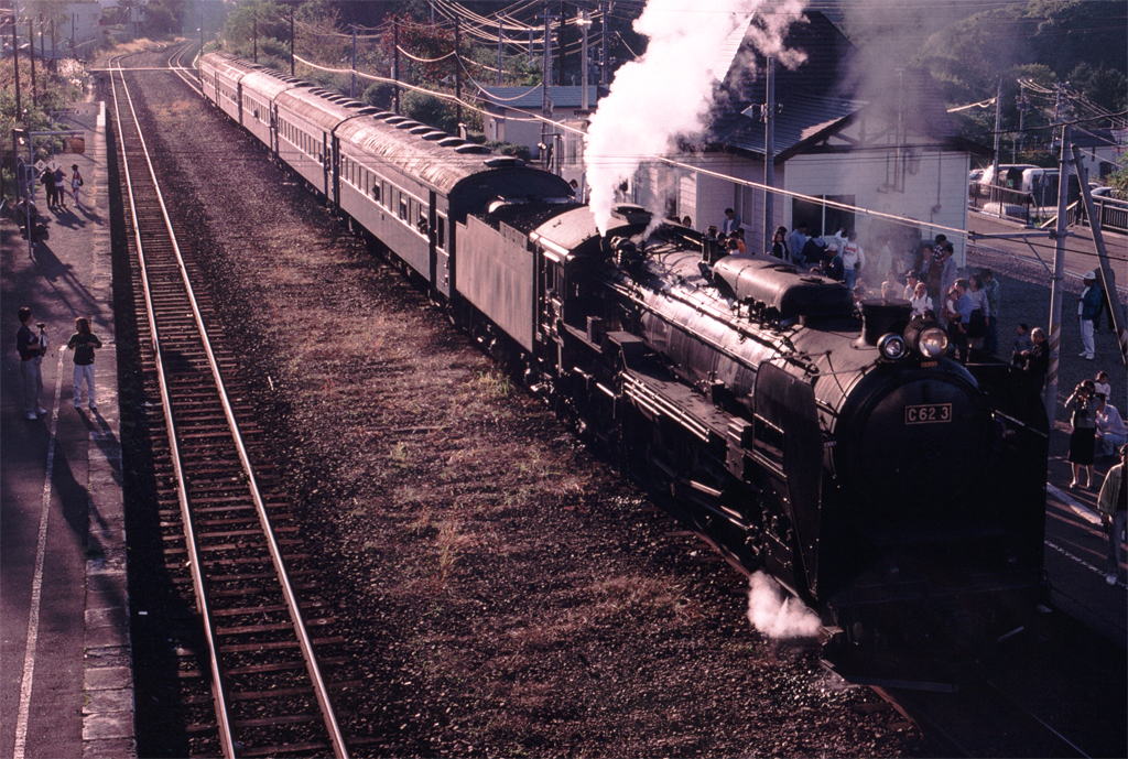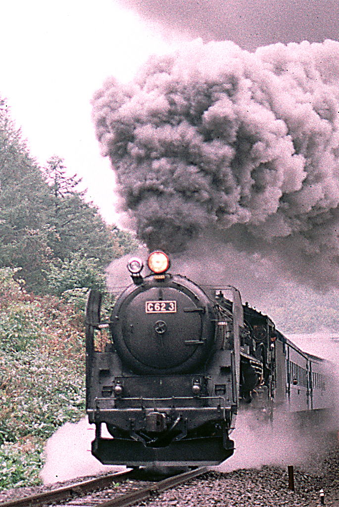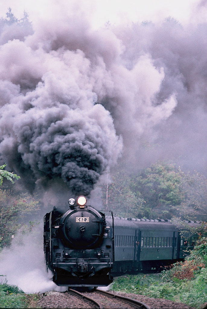 C62ニセコ。撮影に行けたのは一度だけ、運行最終年の1995年。大学を休んで「白鳥」で行き、函館発 「日本海」で帰ってきたのも今となっては思い出の一つ。この年が最終運行年になるという話を、その時点で知っていたのか知らなかったのか記憶は定かではないが、年々運行日数が減り、学生時代の行けるうちに行っておくということで決断したような気もする。10月8日の日曜日と、一日おいて10日の体育の日とに運行される時を狙った。8日に乗車、10日に撮影、と計画したが一か月前の発売日にみどりの窓口に並んだが指定券は瞬殺状態。10日の分は、30分以上前から窓口に並んで手にすることができた。