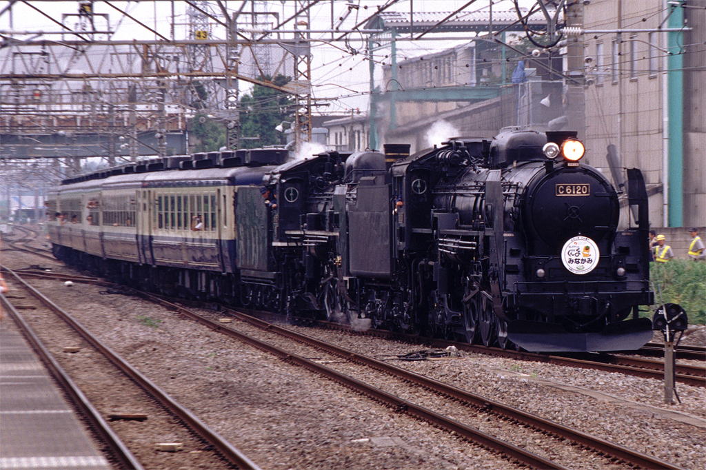 民営化時点で自前のSLを持っていなかったJR東日本だが、駅前や小学校に保存されていたD51とC57を動態復元させて走らせてはいた。その2両だけでは足りなくなったということで2011年に復元されたのが本機。C57180を従えて新前橋駅に進入するところ。