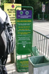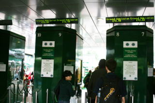 荷物の大きさ制限の看板。下の部分のカゴの中にすっぽり収まる大きさでないと持ち込めない。徹夜で並んでいる人の荷物などは、荷物預かり所に預けることになっているようだ。