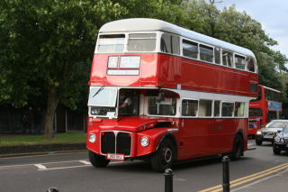 駅前の様子(左)と、会場直行バス(右)。直行バスは、オイスターカードとか、バスの回数券とかは使用不可で、片道£2、往復£3。