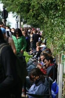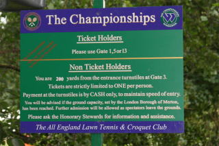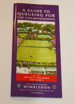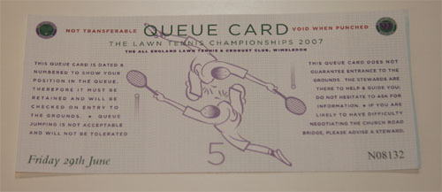 列は、地下鉄のSouthfield駅から歩いて5分ほどの所の公園が最後尾です(ウィンブルドン ビレッジの方から行くと、列の最後尾にたどり着くのが大変なので、地下鉄で行くか、バスで493番に乗って会場前を通りすぎてから下車するのが賢いと思います)。並び始めたら、通し番号の打ってある「QUEUE