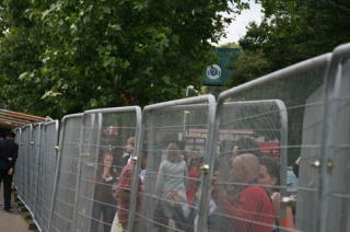 歩道橋(左)。その後、金網で区切られた通路(右)をしばらく歩かされる。右の写真で、木と木の間の丸いマークは、歩道橋に貼り出されている大会のロゴ。歩道橋からこれだけ歩いても、まだ切符売り場は先(ただし、セキュリティチェックの後は普通の速さで歩けるので実際には2分ほどしかかからない)。
