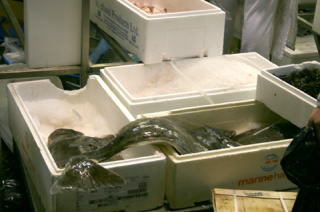 さて、このBillingsgate、8月に行ってきました。一人で行っても食べきれないので、日本人3家族集まっての買い出しです。土曜日の朝、市場に到着したのは6時半過ぎ。駐車場に入る車で道路は一杯になっていましたが、その横をぞろぞろと帰っていく人や車がたくさん。中へ入ってみたら、これまたたくさんの人。しかし、この時間で既に売りきれ、店じまいを始めているところも。人気のある店ほど早く店じまいするのかもしれません。