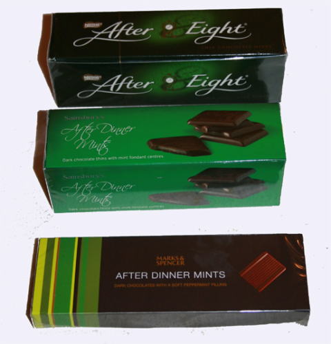 Eight」というお菓子です。この意味は、午後8時過ぎに紅茶と一緒に食べるお菓子、ということでしょうか。類似品は「After Dinner Mints」という、そのままズバリの名前です。薄いチョコレートの中にミントが入っています。確かに、ミルクティーにはよく合います。でも、気をつけないと夕食の後にこんな甘い物を食べると、そう、虫歯になりますね。