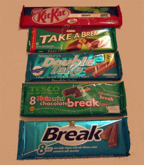 最近は日本でもいろいろな味のKitKatが出てきましたね。イギリスにも、ホワイトチョコレート、イチゴ、などの味もありますが、これは、ミントです。類似品も、パッケージに中身の絵が書いてありますが、見た目はKitKatそのもの。ちなみに、値段は本物が安売りで£1、類似品は60pくらいです。