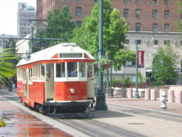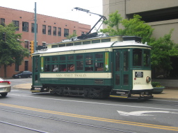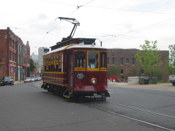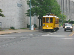 メンフィスと言えば、エルビス・プレスリー、ブルース発祥の地、 黒人解放運動のMartin Luther King牧師が暗殺された街、と知っている人なら知っている街。ここは、観光客用(?)に路面電車を建設し、1993年からダウンタウンを南北に走らせている(複線)。1997年に、それと平行してミシシッピ川沿いに路線延長(こちらは単線)、環状運転が可能になった。2004年3月には、さらに路線延長したとのこと。